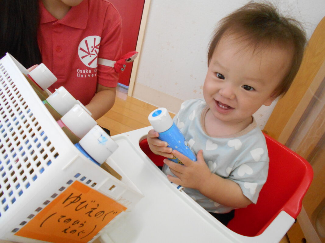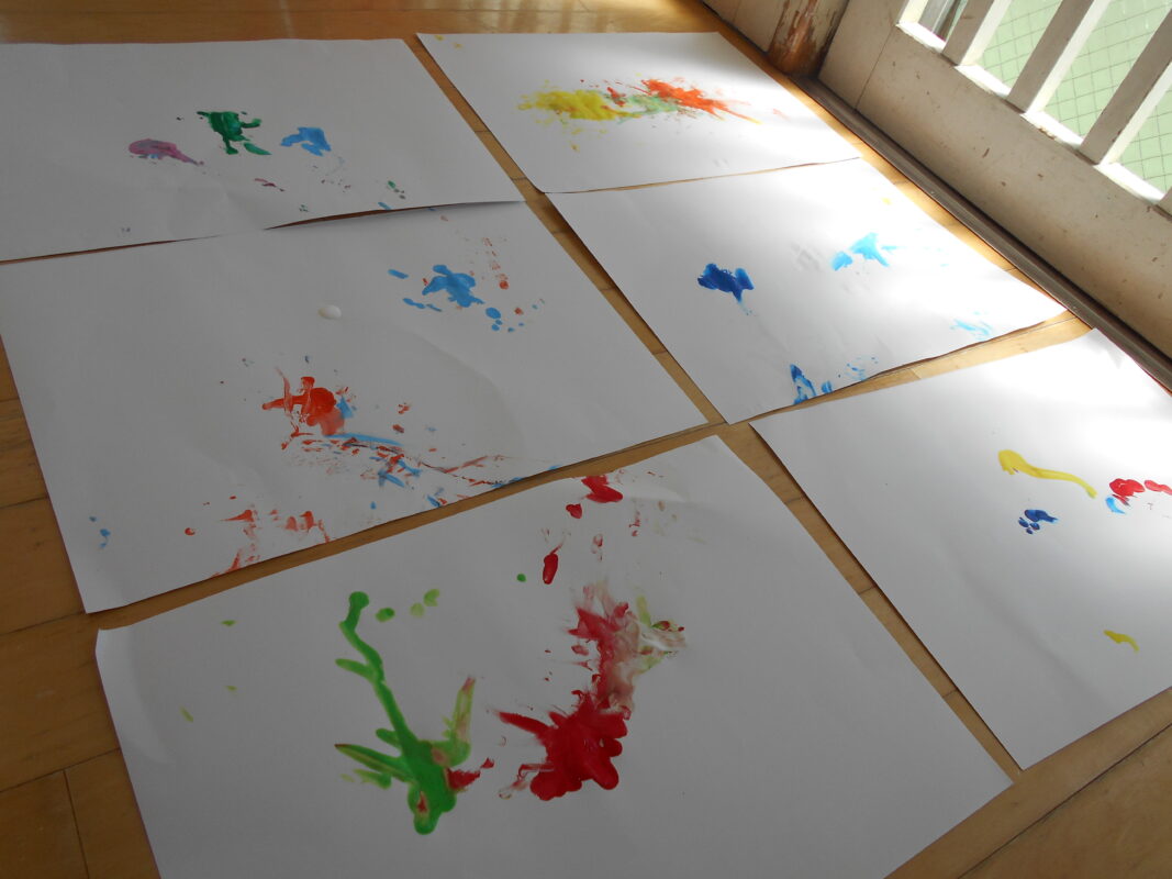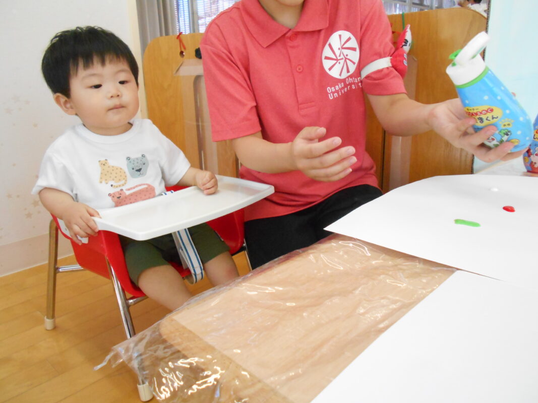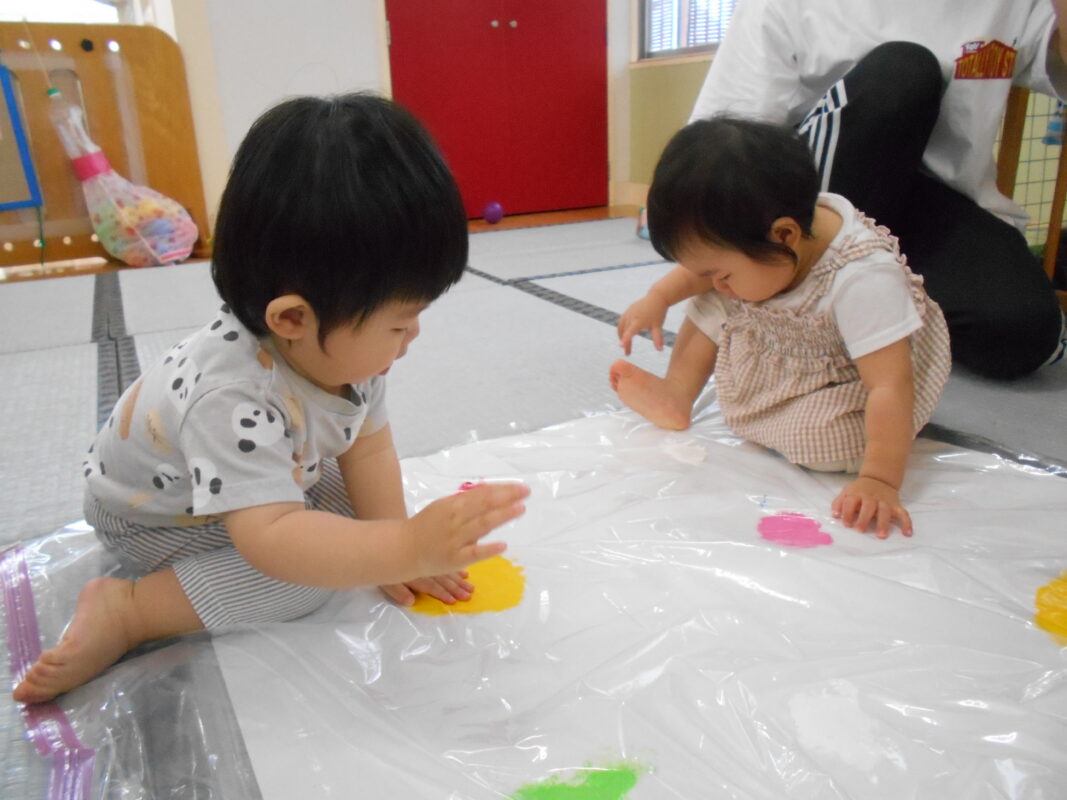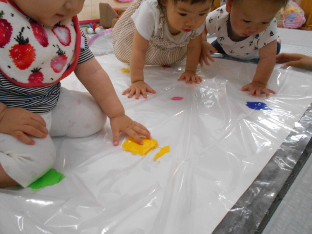 いちご組 いちごぐみ 2025-09-02 9月になりました!まだまだ、暑い日が続きますね! 暑くてお外に出れない日もお部屋で夏の遊びを楽しむ子どもたちを覗いてみましょう~! あ!黄色発見!こっちには青色が!大きな圧縮袋に入っている絵の具を見つけた子どもたち。 指でなぞったり、手でぺちぺちして広げたり 体ごと寝転がって楽しむ姿も見られましたよ♪ こちらは指絵の具。「どれがいい?」と子どもたちに問い、手に取った3色を使用しました! 絵の具が出てくるのをじ~っと見ていますね 保育士がこうやってするんだよ~と見本を見せると真似する子どももいれば、勢いよく手を伸ばして楽しむ子どももいました。 可愛い作品が沢山出来上がりましたね。指絵の具のぬるぬる、べたべたした感触は五感への刺激に繋がります。また、指先や手のひらを使った運動発達の基礎が育つことが期待されますよ。