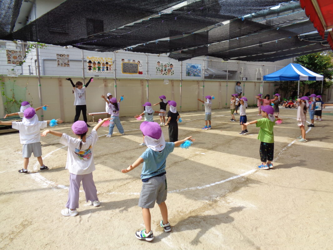 【ぶどう組】毎日元気いっぱいうんどうかいの取り組みをしている子どもたち。ダンスは並ぶ位置を覚え始めて、踊りが揃うように練習中です。子どもたちが考えたポーズもあるのでお楽しみに!!バルーンではみんなで力を合わせていろいろな技に挑戦中です。リレーも力を合わせて頑張ります。