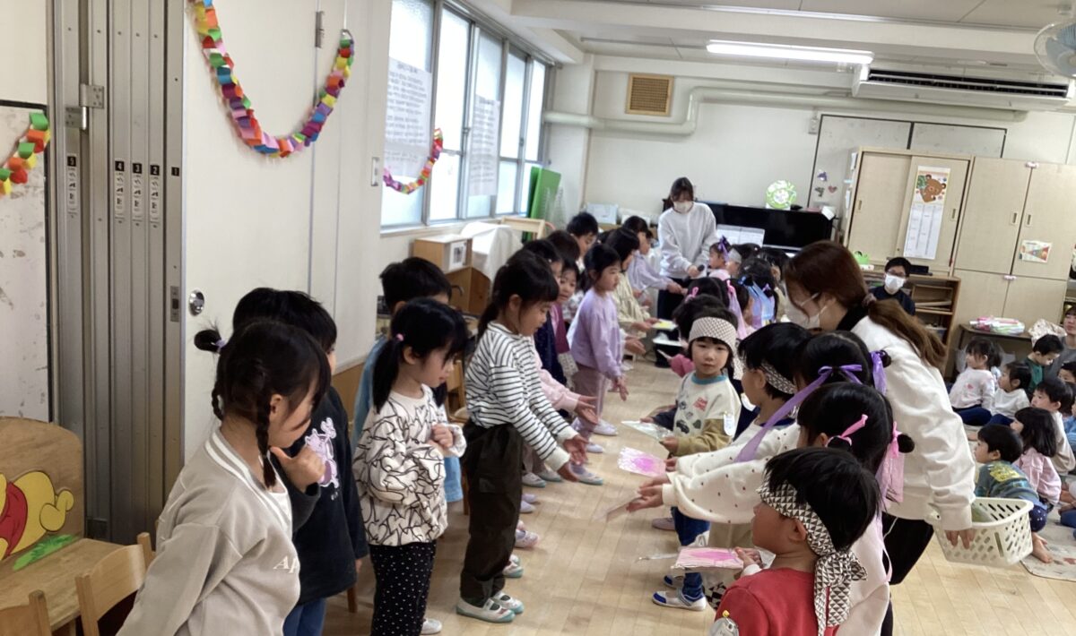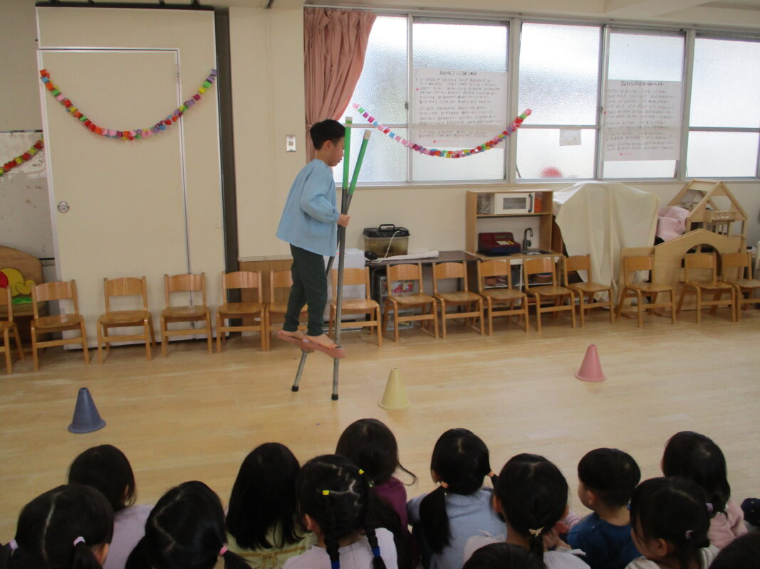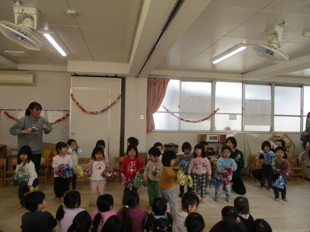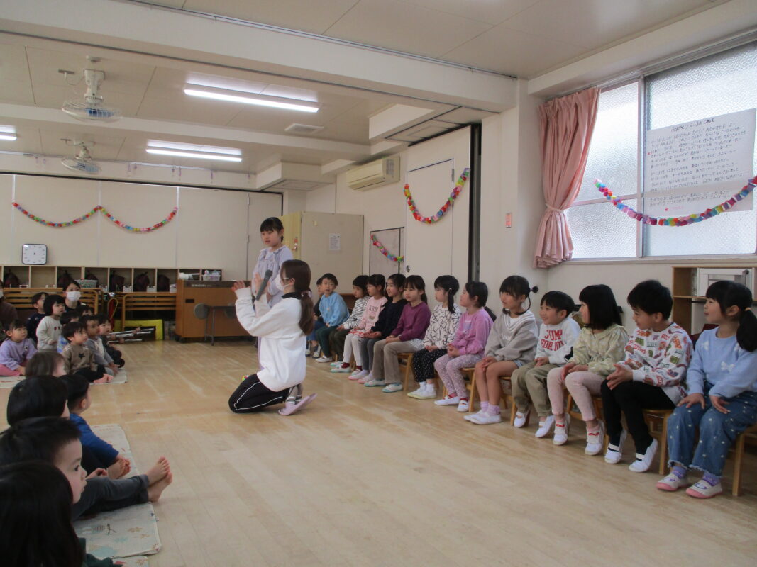 お別れ会がありました イベント 2026-03-07 めろん組さんへインタビュー!お名前と大きくなったら何になりたいかを聞きました。いろいろな夢があり、みんな興味津々でしたよ。 各クラスからありがとうの気持ちをこめて出し物がありました。ダンスや楽器演奏で盛り上げてくれましたよ!とても可愛かったです♡ めろん組さんは得意なことを披露してくれました。こまや大縄跳び、ダンス、折り紙などかっこいい姿を見せてくれました。 そして最後はみんなからのプレゼントを渡しました。めろん組さん、小学校に行っても頑張ってね!